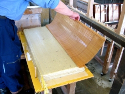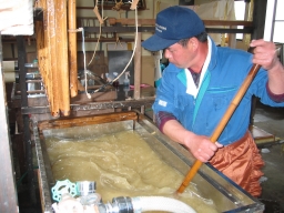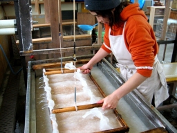 次に枠から簀をはずし、脇に立ててある水きり板に立て掛けて水を切ります。水きり板は、縦にたくさんの溝が掘ってある板で、漉人の左右に1枚づつ置いてあるので、3枚目の簀の時に水の切れたものから押し板の上に重ね、板をはがしていく。