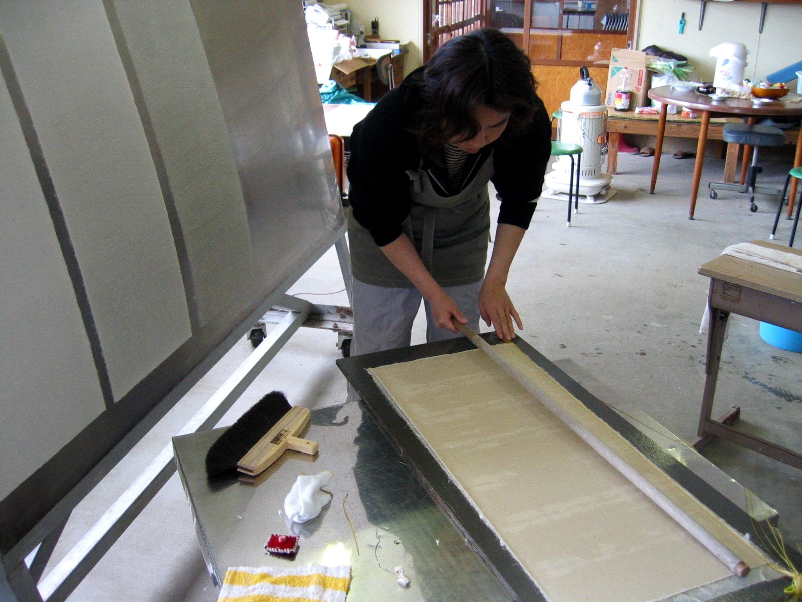 押しかけのすんだものは、次に「おくさたて」を始める。紙と紙の間に挟んだ「おくさ」を手ではぐように引っ張ると、紙が1枚づつはがれるので、「紙つけ棒」にからませ、完全にはがして貼り付ける。