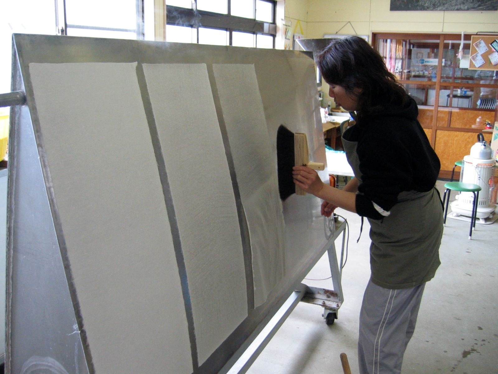 灰水、現在ではソーダ水を用い、よく煮ます。これは、原料に含まれている不純物を取り除くと同時に叩解(こうかい)しやすくします。