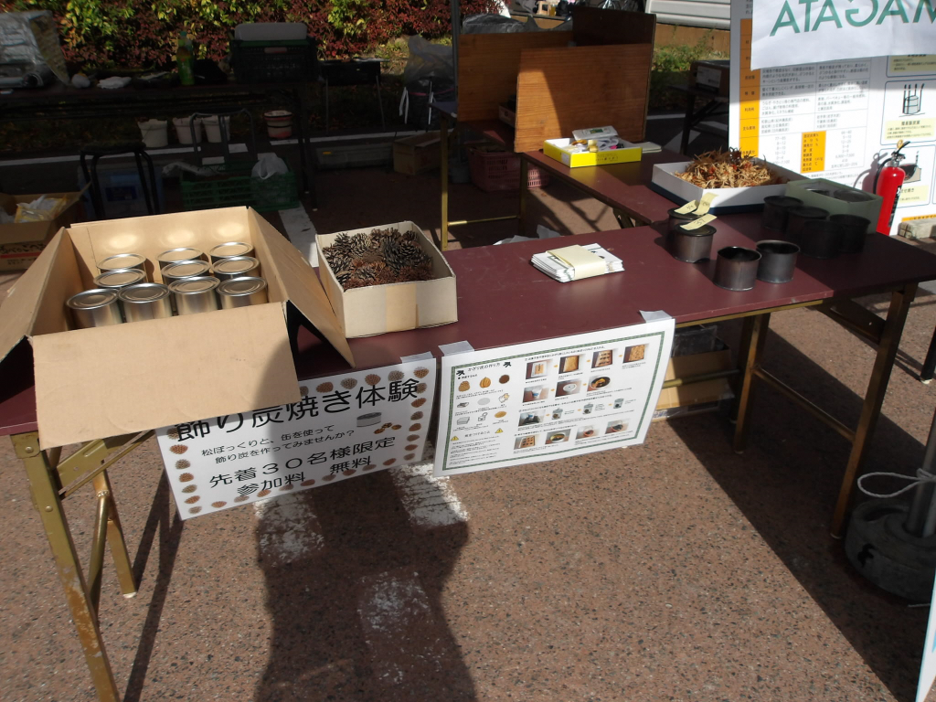令和7年11月1日 白鷹町役場を会場に開催された白鷹町産業フェア2025にて、木炭文化に触れていただけるよう体験ブースを2つ設置しました。