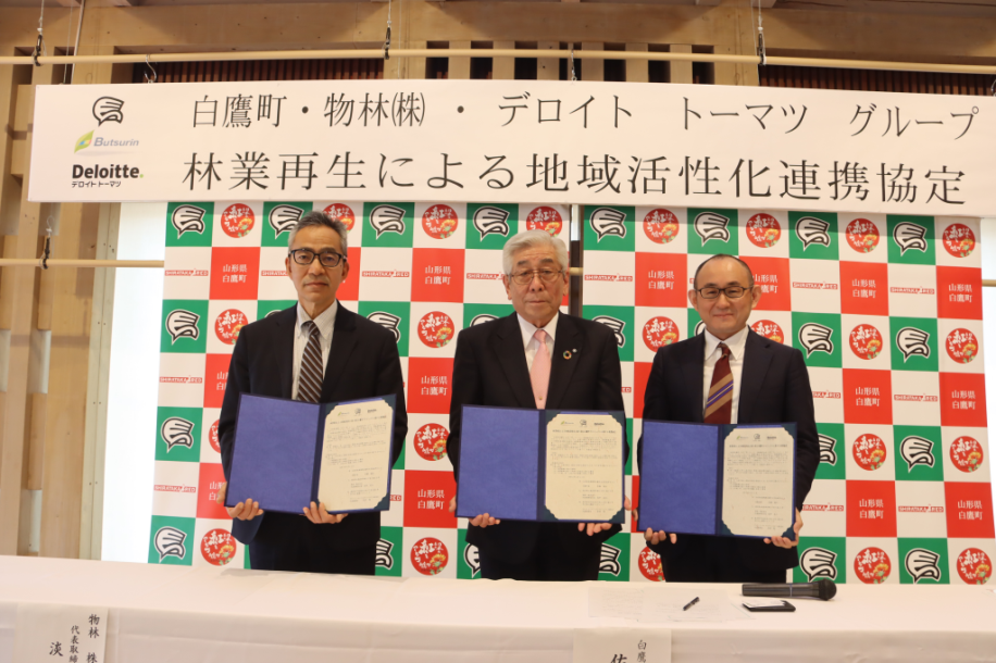 令和5年4月11日、本町では物林株式会社及びデロイト トーマツ グループと「林業再生による地域活性化に取り組む白鷹町プロジェクトに関する連携協定」を締結。同日、中央公民館大会議室にて締結式を実施しました。