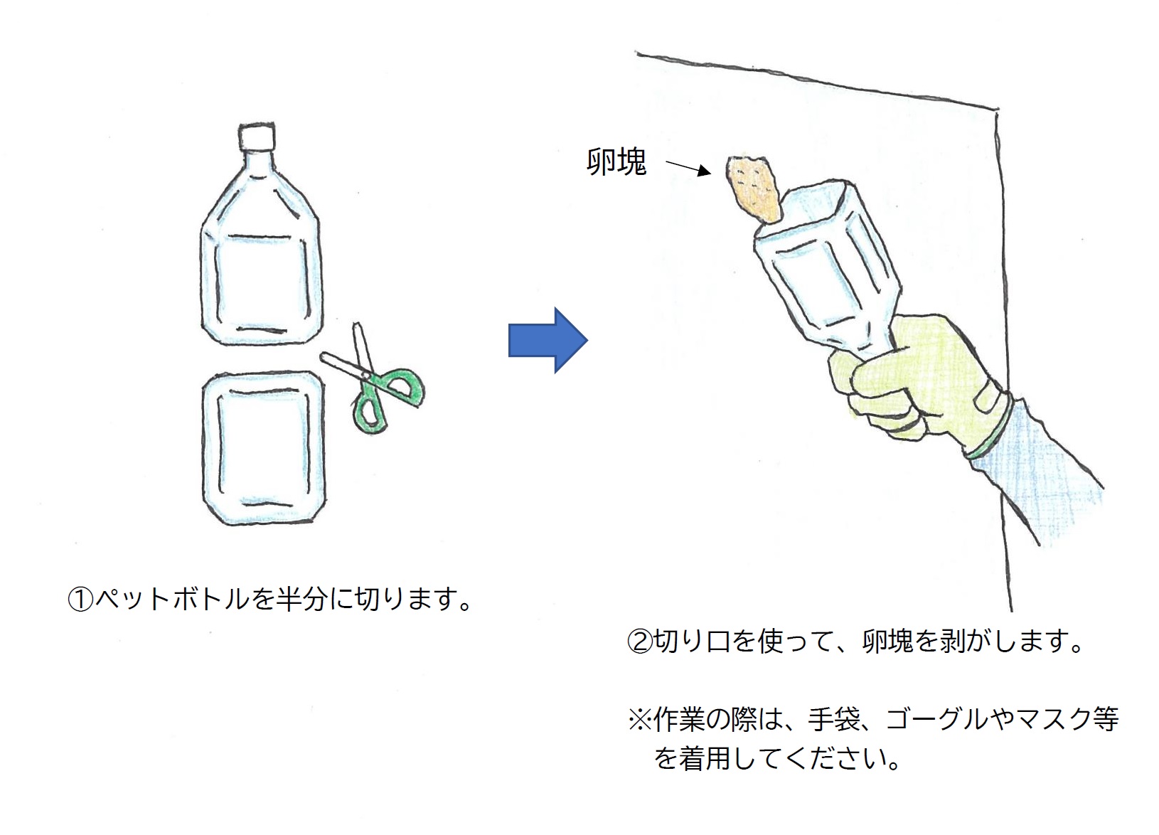 ・卵塊は、ペットボトルを半分に切ったものや、塵(ちり)取りなどの先の平らなもので壁などから剝がすことができます